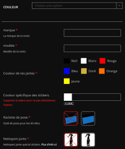 Si le « Kit Classico » ne correspond pas à vos besoins, vous pouvez également personnaliser entièrement votre kit déco en passant par notre configuratore ! Cette page vous permet de créer le kit parfait pour votre moto non référencée. Comme pour les autres modèles, un large choix de designs, de couleurs et d’effets sont disponibles. Il suffit alors d’indiquer pareillement la marque et le modèle dans les zones indiqué.